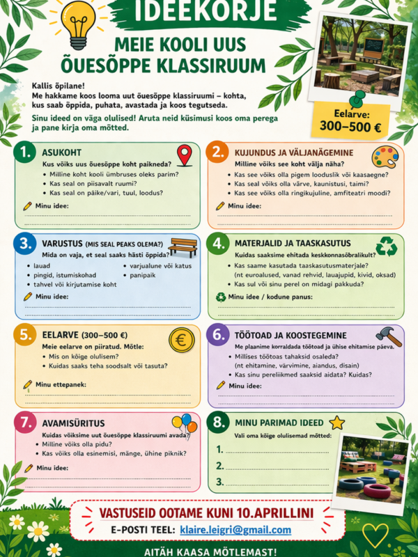 Hea õpilane! Palade kool osaleb rahvusvahelises koostööprojektis, mille raames luuakse koolide juurde uued õuesõppe klassiruumid (Paladel, Läris ja Portugalis). Vajame abi ja ootame sinu häid mõtteid, ideid ja plaane, millin...