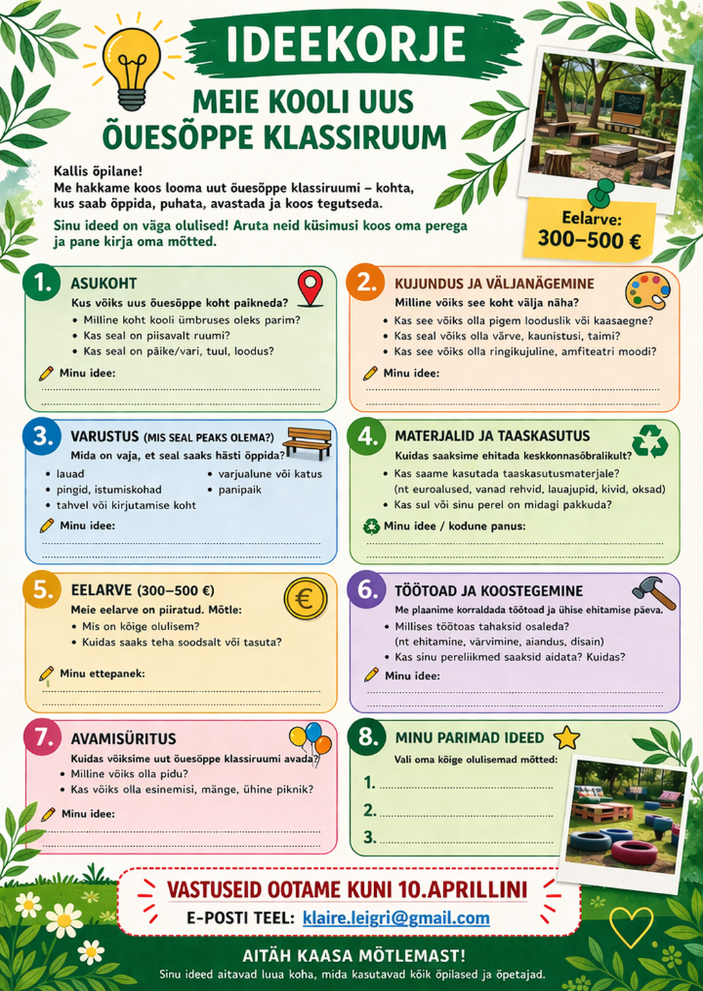 Vajame abi ja ootame sinu häid mõtteid, ideid ja plaane, milline õuesõppe koht sulle meeldiks, millised asjad seal võiksid olla ja kuhu me võiksime selle koha luua?
